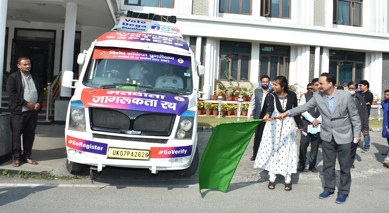 देहरादून, बिग न्यूज़। मुख्य निर्वाचन अधिकारी सौजन्या ने सोमवार को सचिवालय में मतदाता जागरूकता के लिये मतदाता जागरूकता सचल वाहनों (वोटर अवेयरनेस वैन) को रवाना किया। मुख्य निर्वाचन अधिकारी ने बताया कि इस अभियान का मुख्य उद्देश्य युवा मतदाताओं और महिला मतदाताओं को वोटर लिस्ट के पंजीकरण हेतु प्रेषित करना है। इस विषय में जानकारी देते हुए मुख्य निर्वाचन अधिकारी सौजन्या ने बताया कि विधान सभा के आगामी सामान्य निर्वाचन के दृष्टिगत वर्तमान में गतिमान विधान सभा निर्वाचक नामावली का 01.01.2022 की अर्हता तिथि के आधार पर विशेष संक्षिप्त पुनरीक्षण कार्यक्रम के व्यापक प्रचार प्रसार हेतु गढ़वाल एवं कुमायूँ मण्डल के लिए एक-एक वोटर अवेयरनेस वैन को देहरादून से रवाना किया गया।