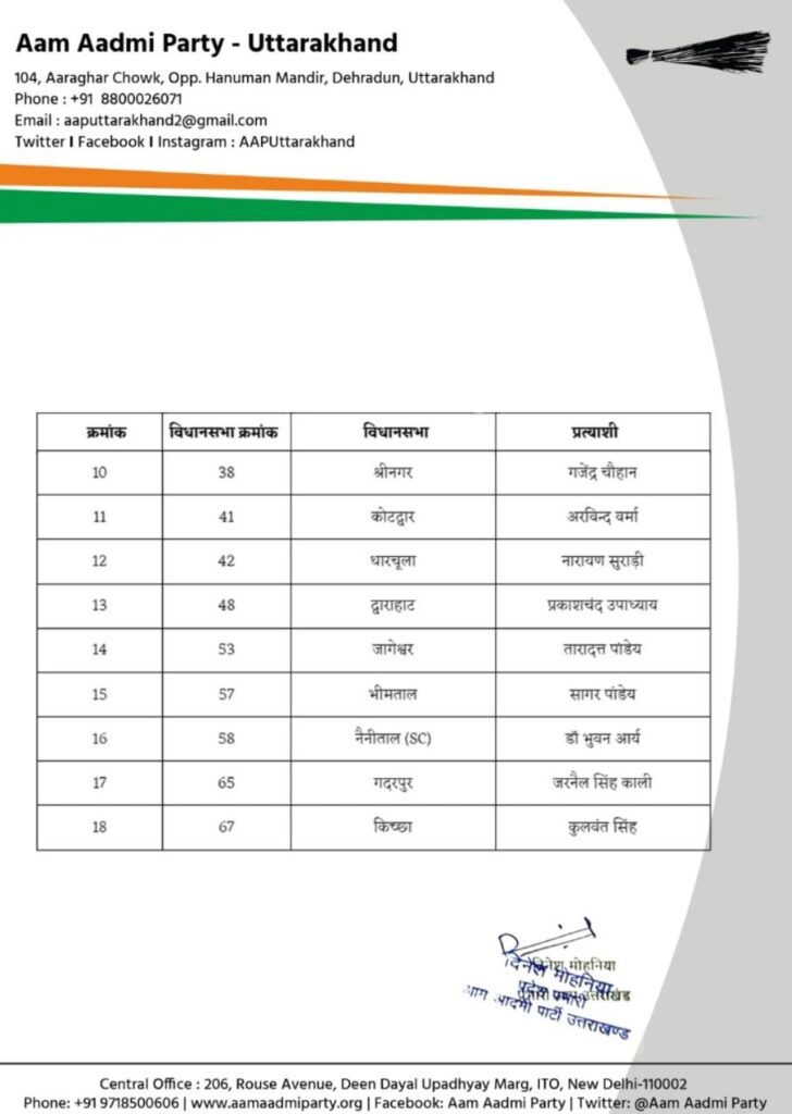 आम आदमी पार्टी ने उत्तराखंड चुनाव के लिए प्रत्याशियों की दूसरी सूची जारी की।