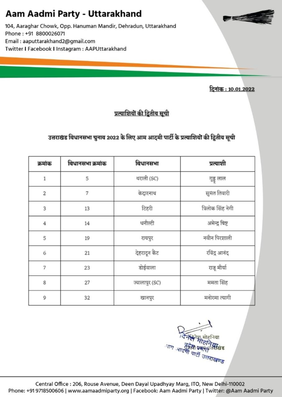 आम आदमी पार्टी ने उत्तराखंड चुनाव के लिए प्रत्याशियों की दूसरी सूची जारी की।