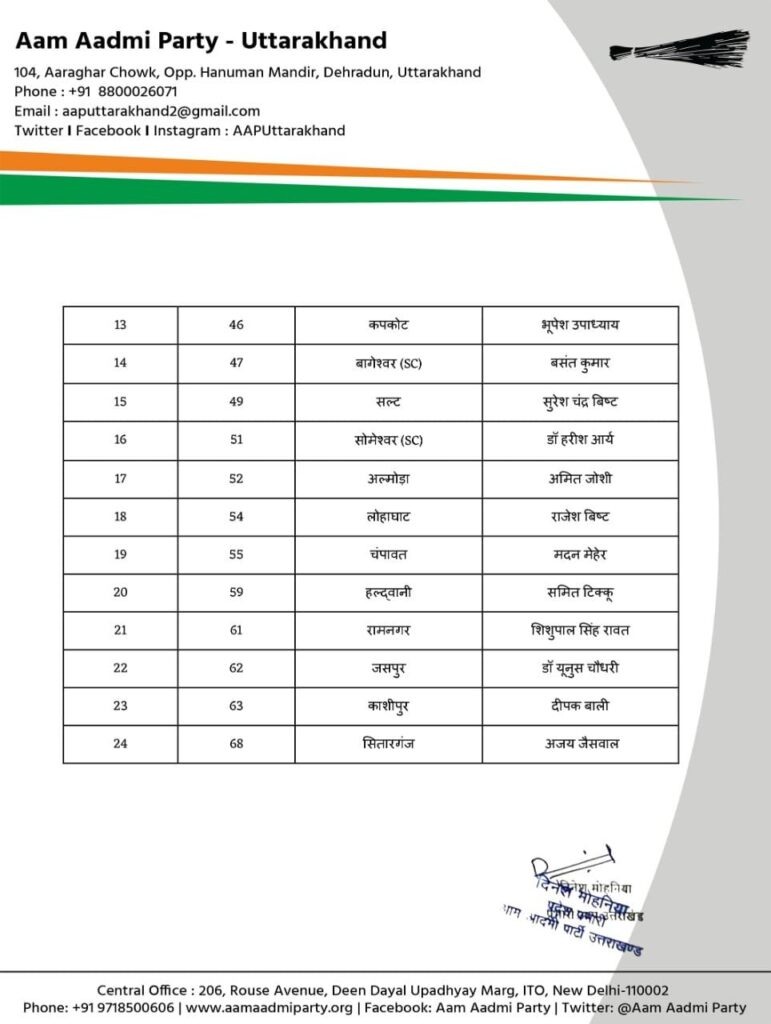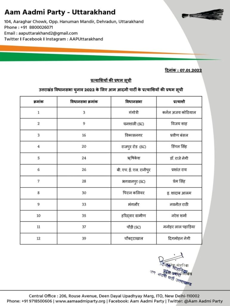 उत्तराखंड विधानसभा चुनाव: आम आदमी पार्टी ने जारी की 24 उम्मीदवारों की पहली लिस्ट, यहाँ पढ़े पूरी लिस्ट