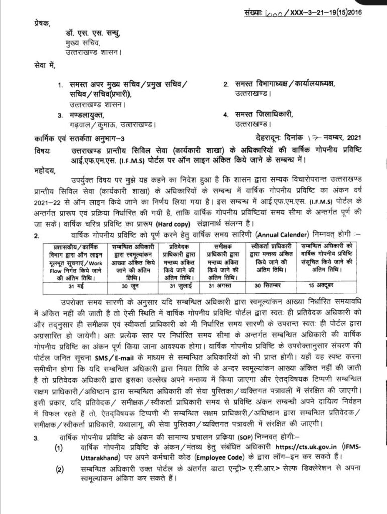 मुख्य सचिव डॉ. सन्धु द्वारा अधिकारियों को दिए गए निर्देश के अनुक्रम में सचिव कार्मिक अरविन्द सिंह ह्यांकी द्वारा उत्तराखण्ड प्रान्तीय सिविल सेवा (कार्यकारी शाखा) के अधिकारियों की वार्षिक गोपनीय प्रविष्टि आई.एफ.एम.एस. पोर्टल पर ऑनलाइन किए जाने के निर्देश दिए गए हैं। उन्होंने बताया कि उत्तराखण्ड प्रान्तीय सिविल सेवा (कार्यकारी शाखा) के अधिकारियों की वार्षिक गोपनीय प्रविष्टि का अंकन वर्ष 2021-22 से ऑनलाइन प्रक्रिया हेतु समय-सीमा भी निर्धारित की गयी है, ताकि वार्षिक गोपनीय प्रविष्टि निर्धारित समय-सीमा के अन्तर्गत पूर्ण की जा सके।