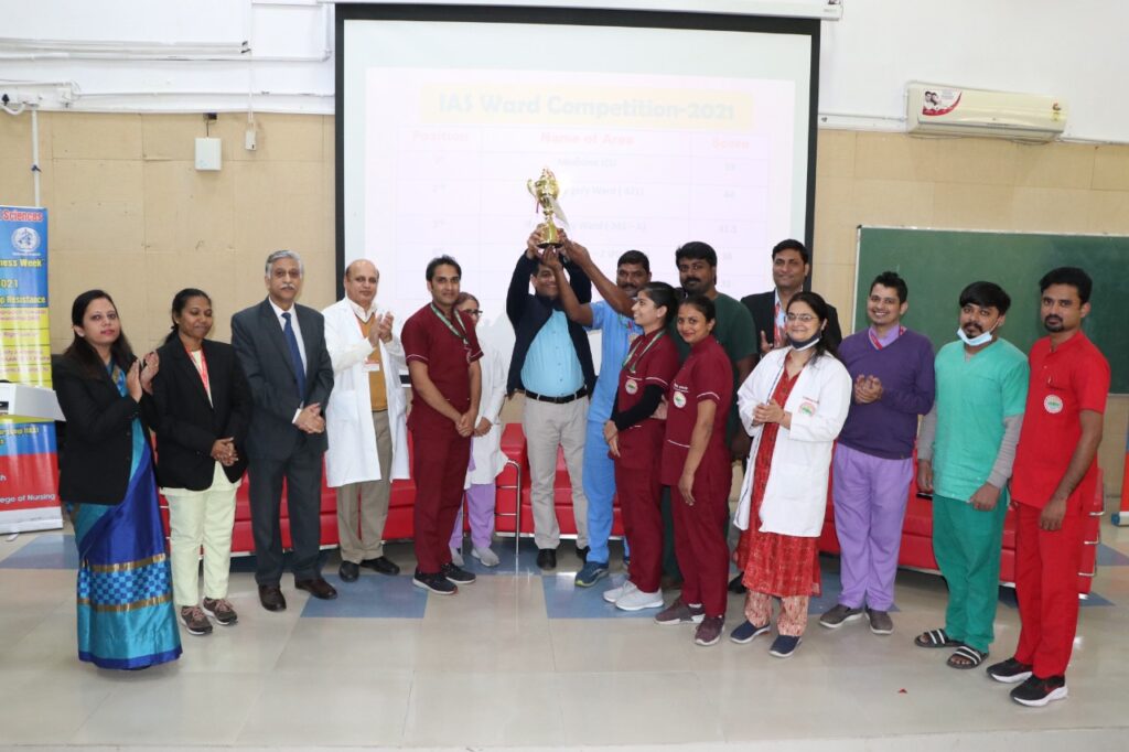 वीक के समापन अवसर पर एम्स अस्पताल के मेडिकल सुपरिटेंडेंट प्रोफेसर अश्विनी कुमार दलाल ने बेस्ट वाॅर्ड की इंटिग्रेटेड एंटीमाइक्रोबियल अवार्ड आईएएस चैंपियनशिप के तहत ट्रॉफी व प्रशस्तिपत्र प्रदान किया गया। इस अवसर पर फार्माकोलााजी विभागाध्यक्ष प्रो. शैंलेंद्र कुुमार हांडू, डिपार्टमेंट ऑफ माइक्रोबायोलॉजी विभागाध्यक्ष डा. नीलम कायस्था, डिपार्टमेंट ऑफ मेडिसिन एचओडी डा. मीनाक्षी धर, न्यूरो सर्जरी विभागाध्यक्ष डा.रजनीश अरोड़ा, डा. जेवियर वैल्सियाल, डा. अंबर प्रसाद, डा. मनीष शर्मा आदि फैकल्टी मेंबर, चिकित्सक मौजूद थे।