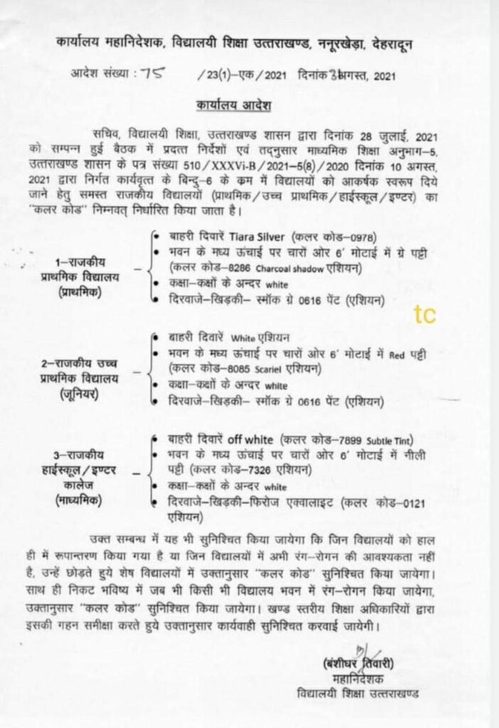 उत्तराखंड में स्कूलों की दीवारों का रंग किस तरीके का होगा उसका आदेश जारी हो गया है इसके लिए राजकीय प्राथमिक विद्यालय हो उच्च प्राथमिक विद्यालय और राजकीय हाई स्कूल इंटर कॉलेज सबका अलग अलग हुआ जी हां आदेश में सचिव, विद्यालयी शिक्षा उत्तराखण्ड शासन द्वारा दिनांक 28 जुलाई, 2021) को सम्पन्न हुई बैठक में प्रदत्त निर्देशों एवं तद्नुसार माध्यमिक शिक्षा अनुभाग-5, उत्तराखण्ड शासन के पत्र संख्या 510 / XXXVI-B / 2021-5 ( 8 ) / 2020 दिनांक 10 अगस्त, 2021 द्वारा निर्गत कार्यवृत्त के बिन्दु 6 के क्रम में विद्यालयों को आकर्षक स्वरूप दिये जाने हेतु समस्त राजकीय विद्यालयों ( प्राथमिक / उच्च प्राथमिक / हाईस्कूल / इण्टर) का “कलर कोड” निम्नवत् निर्धारित किया जाता है।