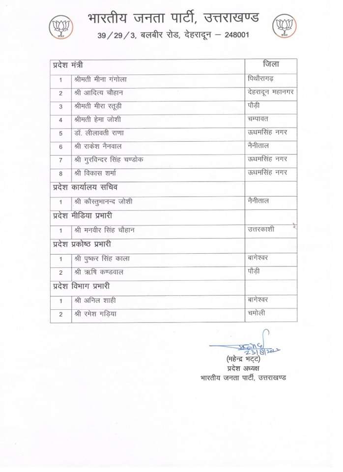 8 नेताओं को दी गई प्रदेश मंत्री की जिम्मेदारी। मीना गंगोला, आदित्य चौहान, मीरा रतूड़ी, हेमा जोशी, लीलावती राणा, राकेश नैनवाल, गुरविंदर सिंह चंडोक और विकास शर्मा को दी गई प्रदेश मंत्री की जिम्मेदारी।
