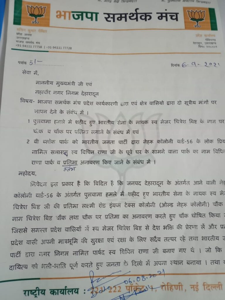 भाजपा समर्थक मंच के प्रदेश अध्यक्ष सचिन दीक्षित के नेतृत्व में मंच के कई पदाधिकारियों ने नेहरू कॉलोनी देहरादून में परिजनों और कई क्षेत्रीय लोगों से मिलकर मांगपत्र अर हस्ताक्षर कराए और मुख्यमंत्री और देहरादून नगर निगम के मेयर को भेजा है। मांगपत्र में लिखा है कि नेहरू कॉलोनी निवासी और पुलवामा हमले के शहीद मेजर चित्रेश बिष्ट के नाम पर एक चौक का नामकरण होना चाहिए और शहीद की प्रतिमा भी स्थापित होनी चाहिए। साथ ही पिछले दिनों दुःखद रूप से दुनिया छोड़ गए लोकप्रिय समाजसेवी और नामित पार्षद विपिन राणा के नाम से बी-ब्लॉक के पार्क का नामकरण करने और स्मृति स्तम्भ स्थापित करने की मांग की है।