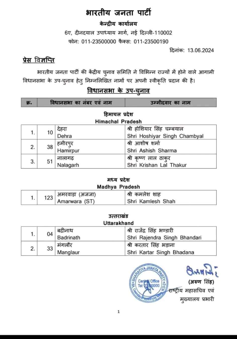 मंगलौर और बद्रीनाथ विधानसभा उपचुनाव के लिए बीजेपी के टिकट घोषित….