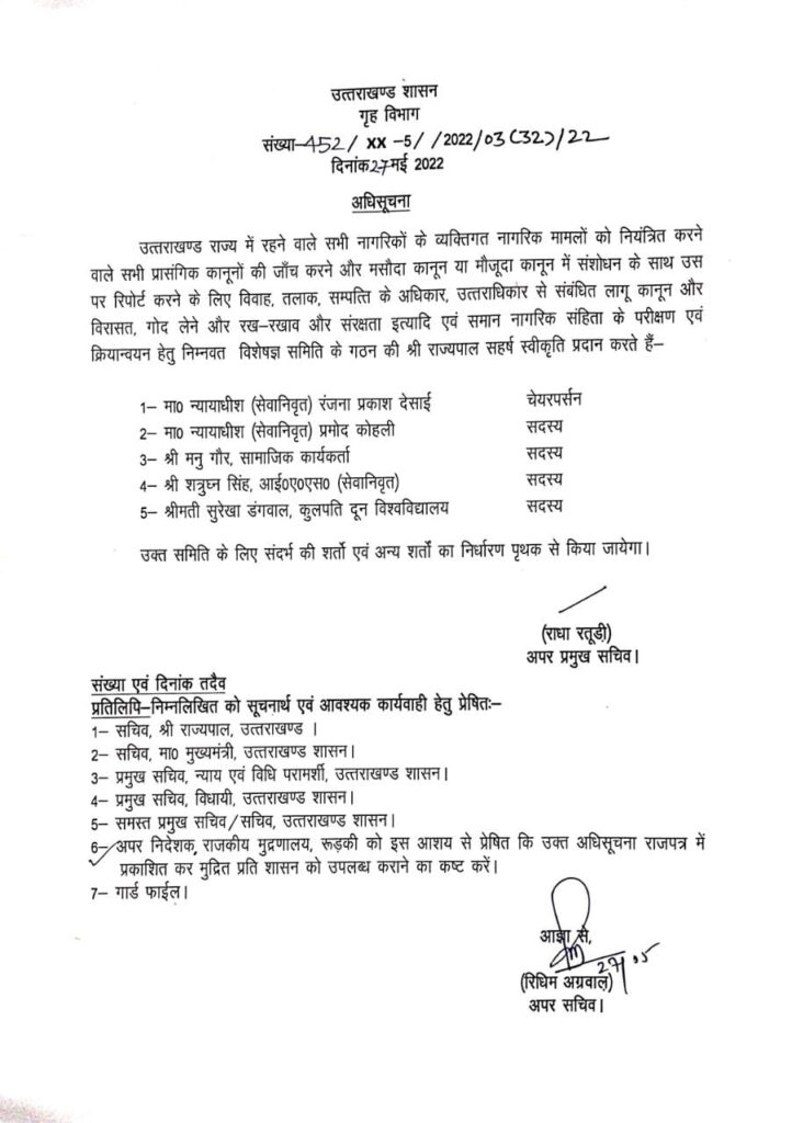 धामी सरकार ने उत्तराखंड राज्य में समान नागरिक संहिता लागू करने की घोषणा की थी। 24 मार्च को हुई मंत्रिमंडल की पहली बैठक में इस घोषणा को मूर्त रूप देने का महत्वपूर्ण निर्णय लिया गया था। आज कमेटी गठित करते हुए आदेश जारी कर दिया गया है।