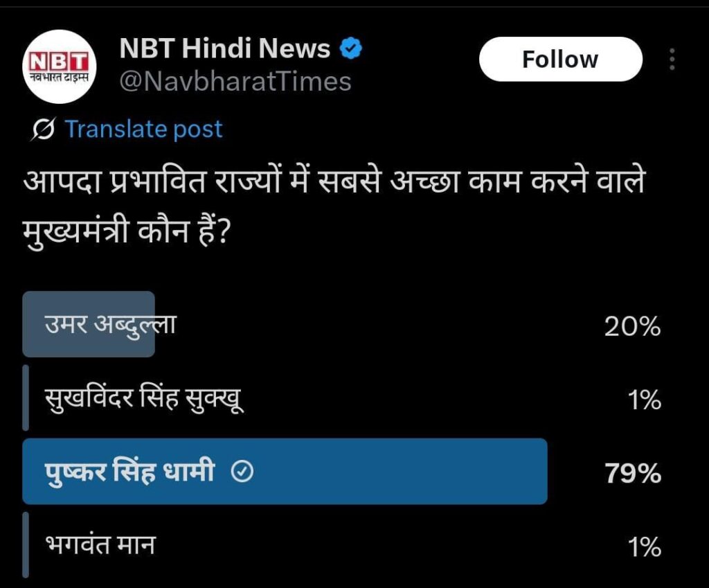 सर्वे के नतीजे साफ़ तौर पर मुख्यमंत्री पुष्कर सिंह धामी के पक्ष में रहे। सीएम धामी को 78.5% मत मिले। जबकि, कश्मीर के सीएम उमर अब्दुल्ला को 20.4%, हिमाचल प्रदेश के सीएम सुखविंदर सिंह सुक्खू को 0.6% और पंजाब के सीएम भगवंत मान को 0.5% वोट प्राप्त हुए।