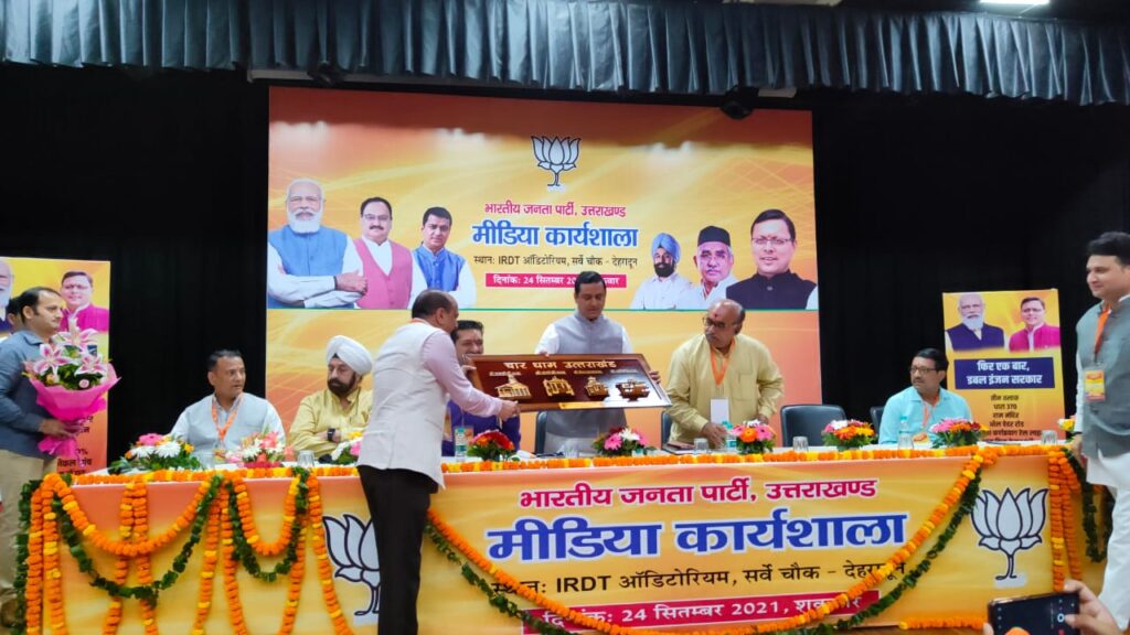 उत्तराखंड में होने वाले 2022 के विधानसभा चुनाव के लिए बीजेपी ने तैयारी तेज कर दी है, इसी के तहत सोशल मीडिया को भी भारतीय जनता पार्टी लगातार मजबूत कर रही है, आज इसी के तहत एक दिवसीय मीडिया कार्यशाला का आयोजन देहरादून में किया गया, मुख्यमंत्री पुष्कर सिंह धामी ने कार्यशाला का द्वीप जलाकर आयोजन किया, मुख्यमंत्री पुष्कर सिंह धामी ने इस दौरान पत्रकारों से बातचीत में मुख्यमंत्री ने कहा कि सोशल मीडिया बहुत ही महत्वपूर्ण भूमिका है पार्टी का पक्ष सही तरह से जनता के बीच में जाएं इसको देखते हुए कार्यशाला आयोजित की गई है, जिसमे सोशल मीडिया के प्रभारियों को प्रशिक्षण किया जा रहा है