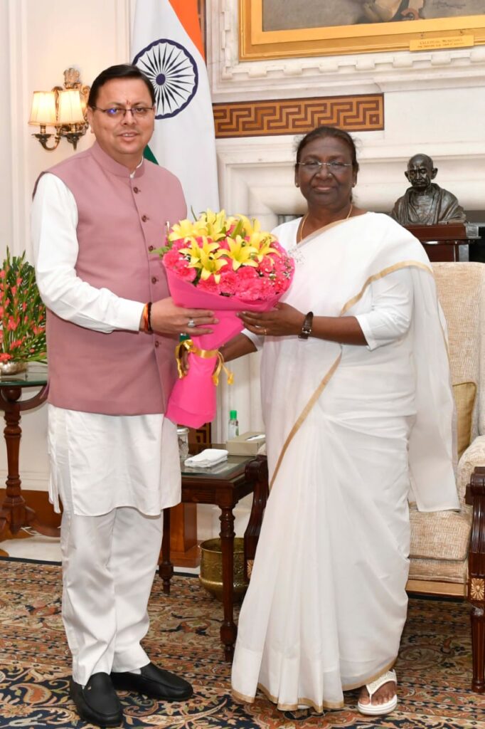 मुख्यमंत्री पुष्कर सिंह धामी ने राष्ट्रपति द्रौपदी मुर्मू से मुलाकात कर ऐतिहासिक जीत होने पर दी बधाई