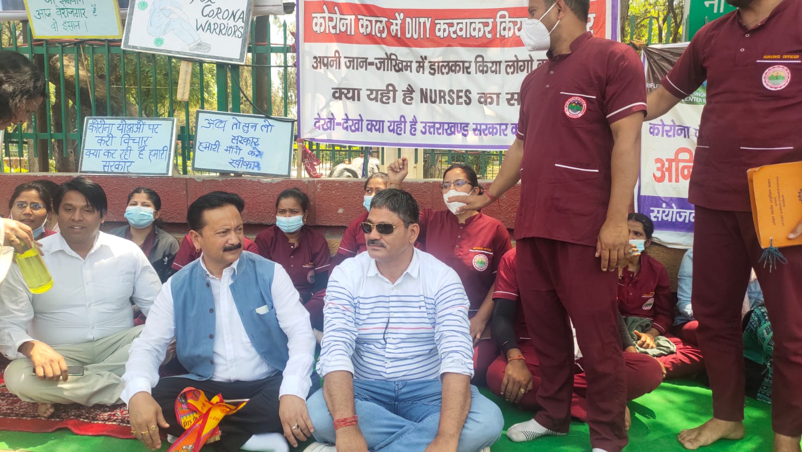 सेवा समाप्त होने से आंदोलनरत स्वास्थ्य कर्मियों के समर्थन में उतरे कांग्रेसी