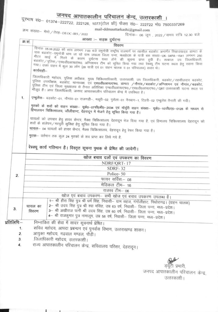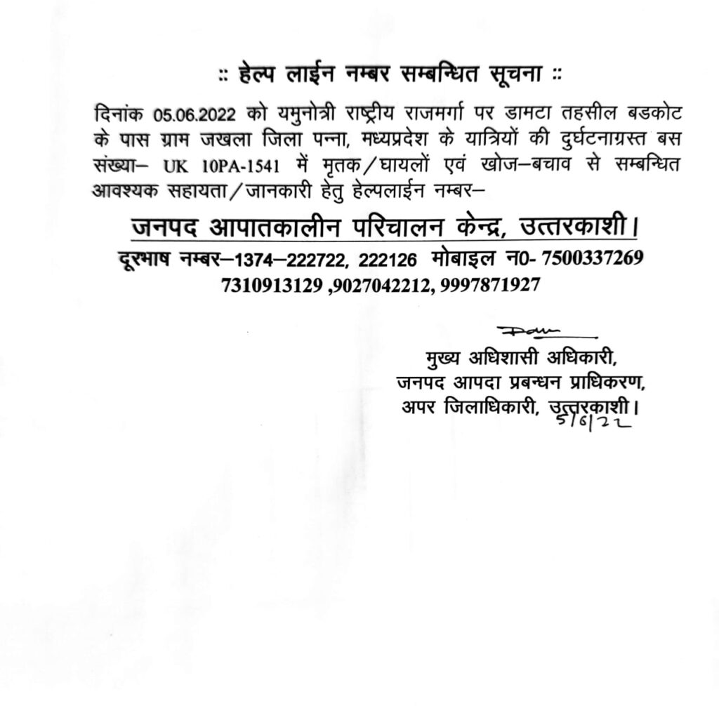 आपदा प्रबंधन विभाग द्वारा दुर्घटना से संबंधित किसी जानकारी या सहायता के लिए टोलफ्री नम्बर भी जारी किया है।