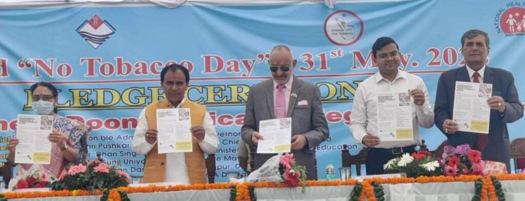 यह बात अण्डमान निकोबार द्वीप समूह के उप राज्यपाल एडमिरल डी.के. जोशी ने आज दून मेडिकल कॉलेज में विश्व तम्बाकू निषेध दिवस पर स्वास्थ्य एवं परिवार कल्याण विभाग द्वारा आयोजित तम्बाकू निषेध शपथ समारोह में बतौर मुख्य अतिथि कही। एडमिरल जोशी ने कहा कि आधुनिक भारत की विकास यात्रा के सहायक यहां के गांव हैं, अगर गांव स्वस्थ होंगे तो देश की प्रगति की रफ्तार उतनी अधिक होगी, इसलिए गांवों का स्वस्थ होना जरूरी है। उन्होंने कहा कि तम्बाकू निषेध में गांवों की भागीदारी बेहद जरूरी है और इस पर उत्तराखंड सरकार गंभीरता से काम कर रही है। उन्होंने कहा कि राष्ट्रीय तम्बाकू नियंत्रण कार्यक्रम के अंतर्गत उत्तराखंड सरकार द्वारा ‘आओ गांव चलें, उत्तराखंड को तम्बाकू मुक्त’ अभियान संचालित किया जा रहा है जिसका ध्येय तम्बाकू मुक्त सोसाइटी डेवलप करना है। एडमिरल जोशी ने कहा कि मैदान की अपेक्षा पहाड़ के लोगों में श्वास एवं छाती रोग की समस्या कहीं अधिक है जिसके पीछे कई कारण है, लेकिन इन सब में सबसे मुख्य कारण धुम्रपान और तम्बाकू सेवन है जो कि खासा चिंताजनक है। कार्यक्रम को सम्बोधित करते हुए सूबे के स्वास्थ्य मंत्री डॉ0 धन सिंह रावत ने बताया कि सूबे में स्वास्थ्य व्यवस्थाओं को मजबूत कर प्रत्येक व्यक्ति को स्वास्थ्य सेवाएं उपलब्ध कराना राज्य सरकार की प्राथमिकताओं में शामिल है। उन्होंने बताया कि सरकार ने वर्ष 2025 तक 15 फीसदी लोगों को तम्बाकू सेवन की लत से छुटकारा दिलवाने का लक्ष्य रखा है इसके लिये स्वास्थ्य एवं परिवार कल्याण विभाग द्वारा विगत एक माह से ‘आओ गांव चलें, उत्तराखंड को तम्बाकू मुक्त’ अभियान संचालित किया जा रहा है। इस अभियान के जरिये लोगों को तम्बाकू निषेध के प्रति जागरूक किया जा रहा है। उन्होंने बताया कि विश्व तम्बाकू निषेध दिवस के अवसर पर आज प्रदेशभर में 5 हजार स्थानों पर पांच लाख लोगों ने तम्बाकू निषेध की शपथ ली, जिनमें राजकीय विश्वविद्यालय, महाविद्यालय एवं स्कूली छात्र-छात्राओं सहित शिक्षा, स्वास्थ्य एवं पंचायतीराज विभाग के अधिकारी एवं कर्मचारी शामिल हैं। स्वास्थ्य मंत्री ने बताया कि इस मुहिम के अंतर्गत सूबे के सभी शिक्षण संस्थानों एवं प्रत्येक विकासखंड में दो-दो गांवों को तम्बाकू मुक्त करने का लक्ष्य रखा गया है।