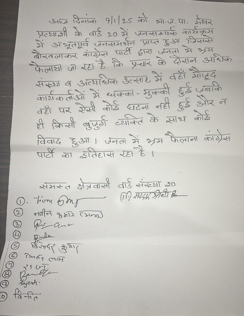 क्षेत्रीय लोगों ने एक सूचना जारी करके कहा है कि “आज दिनांक 09-01-2025 को भाजपा मेयर प्रत्याशी के वार्ड 20 में जनसंपर्क कार्यक्रम में अभूतपूर्व जनसमर्थन प्राप्त हुआ, जिससे बौखलाकर कांग्रेस पार्टी द्वारा जनता में भ्रम फैलाया जा रहा है कि प्रचार के दौरान अधिक संख्या व अत्यधिक उत्साह में वहां मौजूद कार्यकर्ताओं में धक्का-मुक्की हुई, जबकि वहां पर ऐसी कोई घटना नहीं हुई है और न ही किसी बुजुर्ग व्यक्ति के साथ कोई विवाद हुआ है। जनता में भ्रम फैलाना कांग्रेस पार्टी का इतिहास रहा है।” पत्र पर नवीन कुमार, विरेंद्र कुमार, किशन लाल, राजू, राजेश, विनीत सहित कई लोगों के हस्ताक्षर हैं।