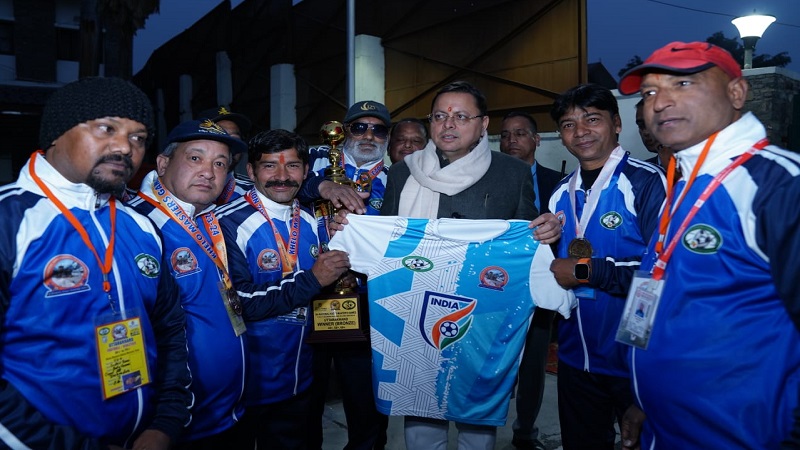 देहरादून, बिग न्यूज़ टूडे: मुख्यमंत्री पुष्कर सिंह धामी ने बुधवार को सांय मुख्यमंत्री आवास स्थित मुख्य सेवक सदन में इंटरनेशनल फुटबाल प्रतियोगिता मे प्रतिभाग करंने वाले 24 खिलाड़ियों को और खेलो मास्टर्स नेशनल फुटबाल प्रतियोगिता 2023 मे काँस्य पदक जीतने पर 75 खिलाड़ियों को सम्मानित किया।