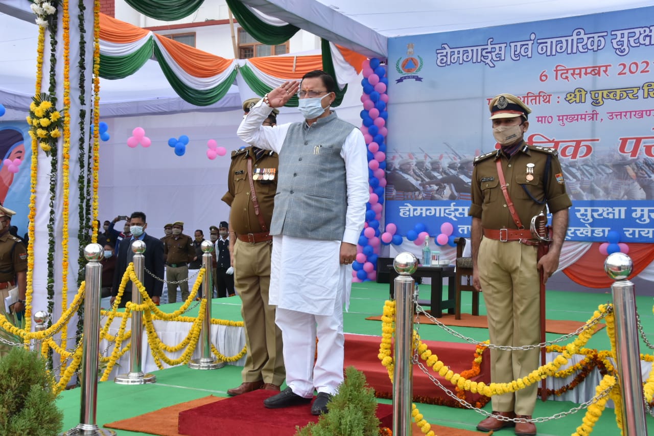 मुख्यमंत्री पुष्कर सिंह धामी ने भव्य परेड की सलामी ली और विभागीय स्मारिका का विमोचन किया। इस अवसर पर मुख्यमंत्री ने होमगार्ड्स तथा नागरिक सुरक्षा विभाग के  अधिकारियों को उनके कार्यों के प्रमाण-पत्र से सम्मानित किया। मुख्यमंत्री ने कोविड ड्यूटी के दौरान दिवंगत होमगार्ड स्व० रोशन सिंह की पत्नी श्रीमती बबीता को 02 लाख रूपये की राशि का चेक प्रदान किया। होमगार्ड राजबहादुर को 01 लाख रूपये की सहायता राशि का चेक प्रदान किया गया।