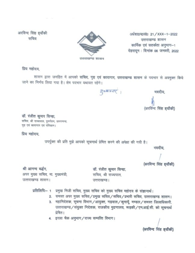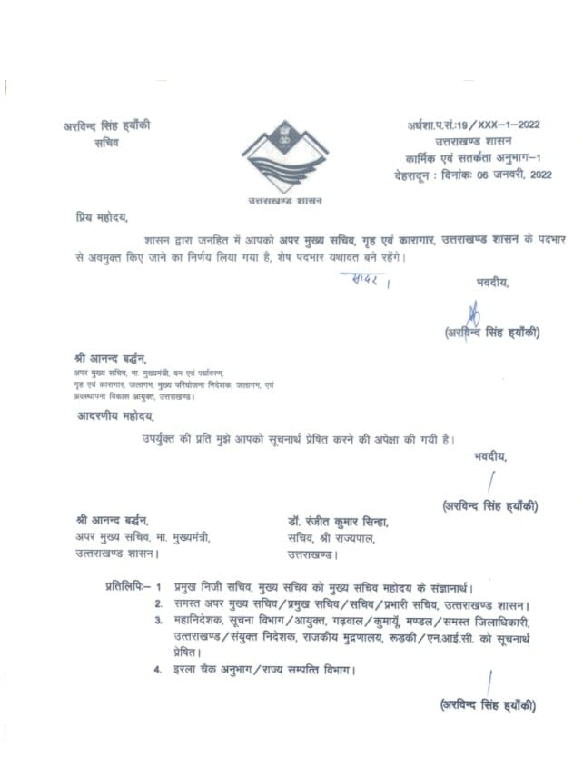 आईएएस अधिकारी आनंद बर्द्धन से अपर मुख्य सचिव सचिव गृह एवं कारागार की जिम्मेदारी हटी,