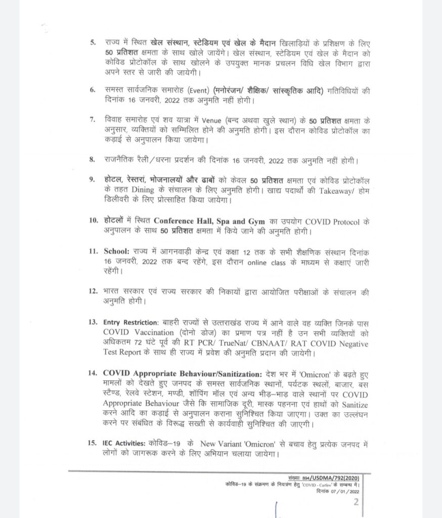 6. समस्त सार्वजनिक समारोह (Event) (मनोरंजन / शैक्षिक सांस्कृतिक आदि) गतिविधियों की दिनांक 16 जनवरी, 2022 तक अनुमति नहीं होगी।