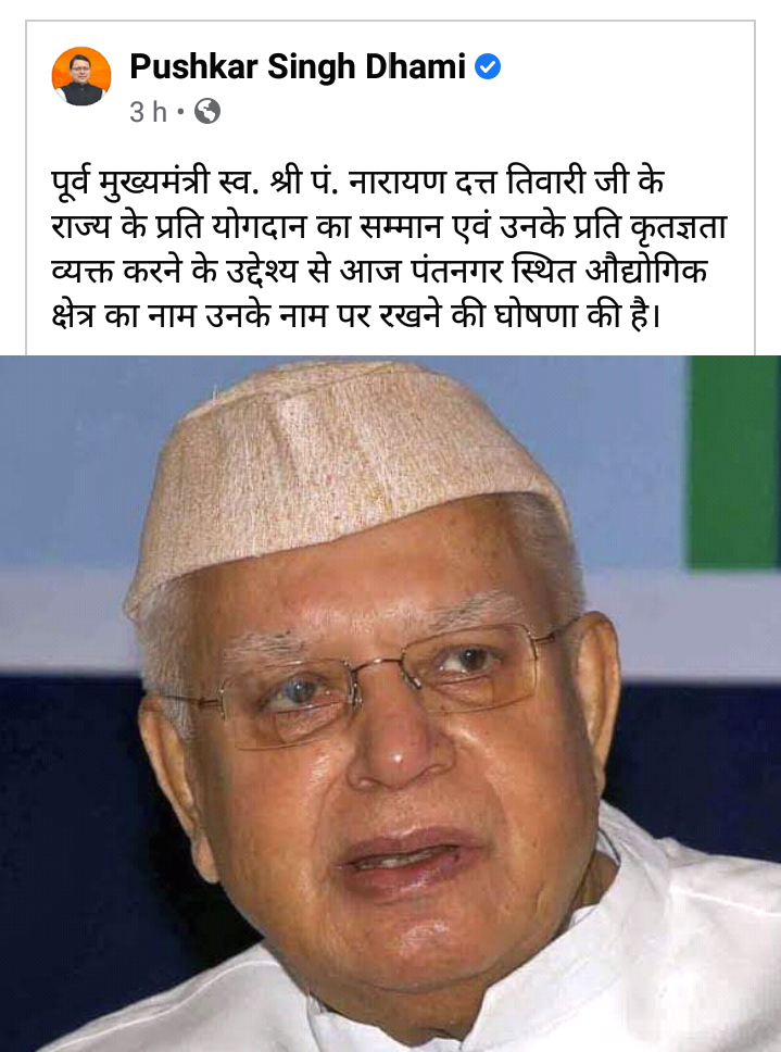 लेकिन इसके साथ ही बड़ी खबर ये भी है कि मुख्यमंत्री पुष्कर सिंह धामी ने काँग्रे की रैली से पहले ही स्वर्गीय एनडी तिवारी की स्मृति में मास्टर स्ट्रोक मारते हुए पंतनगर औद्योगिक क्षेत्र का नाम एनडी तिवारी के नाम पर रखने की घोषणा की है। मुख्यमंत्री पुष्कर सिंह धामी ने फेसबुक वॉल पर जानकारी देते हुए लिखा है कि “पूर्व मुख्यमंत्री स्व. श्री पं. नारायण दत्त तिवारी जी के राज्य के प्रति योगदान का सम्मान एवं उनके प्रति कृतज्ञता व्यक्त करने के उद्देश्य से आज पंतनगर स्थित औद्योगिक क्षेत्र का नाम उनके नाम पर रखने की घोषणा की है।”