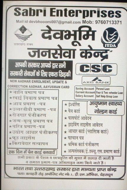आपको बता दे कि देहरादून में ज़िला अधिकारी कार्यालय के सामने देवभूमि जन सेवा केंद्र खुल गया है । जहां सभी ज़रूरत के दस्तावेज़ो और सभी आधार के काम किए जाते है देवभूमि जन सेवा केंद्र के संचालक शादमान साबरी ने बताया कि आमतौर पर यहां रोजाना बहुत से लोग आधार बनवाने या उससे संबंधित अन्य काम के लिए पहुंचते है ।ये देवभूमि जन सेवा केंद्र सप्ताह में पूरे सात दिन (सोमवार से रविवार) सुबह साढ़े आठ बजे से शाम पांच बजे तक खुलता है , और हालाँकि कुछ आधार सेवा केंद्र सप्ताह में पूरे दिन नहीं खुलते है लेकिन हमारा देवभूमि केंद्र पूरे हफ़्ते खुलता है ताकि लोगों को छुट्टी के दिन भी कोई परेशानी हो तो हमारा एकमात्र ज़रूरी कामों के किए हमारा केंद्र हमेशा जनता के लिए खुला है ।