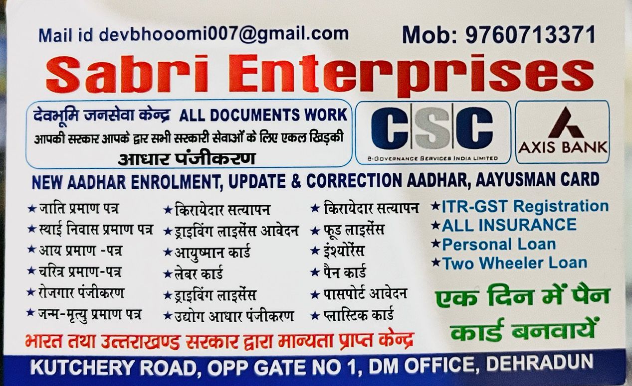 आपको बता दे कि देहरादून में ज़िला अधिकारी कार्यालय के सामने देवभूमि जन सेवा केंद्र खुल गया है । जहां सभी ज़रूरत के दस्तावेज़ो और सभी आधार के काम किए जाते है देवभूमि जन सेवा केंद्र के संचालक शादमान साबरी ने बताया कि आमतौर पर यहां रोजाना बहुत से लोग आधार बनवाने या उससे संबंधित अन्य काम के लिए पहुंचते है ।ये देवभूमि जन सेवा केंद्र सप्ताह में पूरे सात दिन (सोमवार से रविवार) सुबह साढ़े आठ बजे से शाम पांच बजे तक खुलता है , और हालाँकि कुछ आधार सेवा केंद्र सप्ताह में पूरे दिन नहीं खुलते है लेकिन हमारा देवभूमि केंद्र पूरे हफ़्ते खुलता है ताकि लोगों को छुट्टी के दिन भी कोई परेशानी हो तो हमारा एकमात्र ज़रूरी कामों के किए हमारा केंद्र हमेशा जनता के लिए खुला है ।