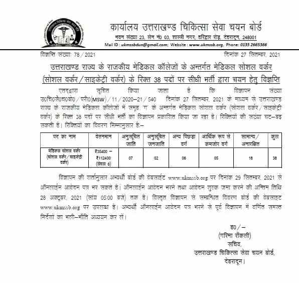 धामी सरकार ने अलग – अलग विभागों में भर्ती (uttarakhand govt jobs 2021) जारी हो रही है । अब राज्य के मेडिकल कॉलेजों हेतु समूह ‘ ग ‘ के अंतर्गत मेडिकल सोशल वर्कर ( सोशल वर्करसाइकेट वर्कर ) के रिक्त 38 पदों पर सीधी भर्ती हेतु उत्तराखंड चिकित्सा सेवा चयन बोर्ड ने विज्ञप्ति जारी की है । जिसके लिए ऑनलाइन आवेदन की प्रक्रिया 29 सितम्बर 2021 से शुरू हो जाएगी ।