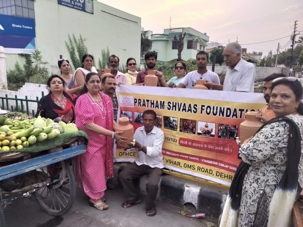 जानकारी देते हुए प्रथम श्वास की अध्यक्ष अनामिका जिंदल ने बताया कि यह कार्य हमने 30 मई 2024 को शुरू किया जिसमें हमने 60 मटके सब्जी वालों को दून क्लब के बाहर वितरित करें 31 मई को 25 मटके मोहित विहार मे वितरित किए गए व एक जून को एक इन्दर रोड पर 30 मटके वितरित किए गए व शाम 6:30 बजे लालपुर चौक से सहारनपुर रोड पर लगभग 80 लोगों को मटके वितरित किए।