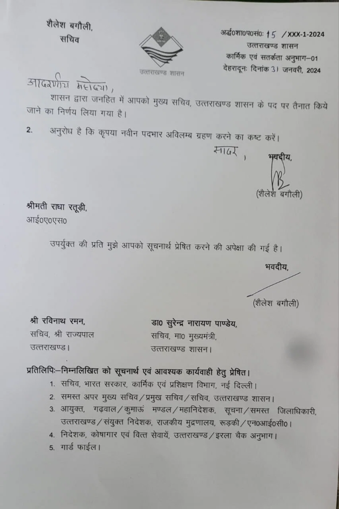 देहरादून, बिग न्यूज़ टूडे: उत्तराखंड को आज पहली महिला मुख्य सचिव मिल गई है। सरकार ने आईएएस राधा रतूड़ी को प्रदेश का नया मुख्य सचिव बनाया है। बुधवार सुबह इसके आदेश जारी हो गए हैं। बता दें कि 1988 बैच के आईएएस अधिकारी मुख्य सचिव डॉ.एसएस संधु का कार्यकाल आज समाप्त हो गया है। संधु को सेवानिवृत्ति के बाद छह महीने का एक्सटेंशन दिया गया था, जो आज पूरा हो गया।