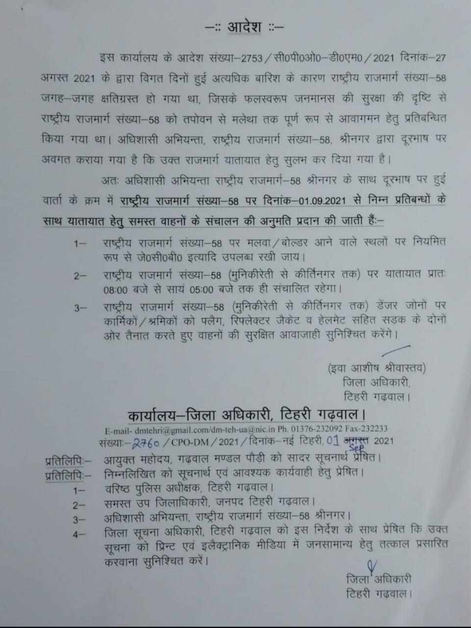 लेकिन अब तोताघाटी के पास आए चट्टानी मलबे को हटाने के बाद टिहरी जिला प्रशासन ने सशर्त यातायात शुरू करने की अनुमति दे दी है। राजमार्ग पर सिर्फ दिन में ही यातायात की अनुमति मिली है। टिहरी जिलाधिकारी ईवा आशीष श्रीवास्तव ने आदेश जारी करते हुए कहा है कि अधिशासी अभियन्ता राष्ट्रीय राजमार्ग संख्या-58, श्रीनगर द्वारा दूरभाष पर अवगत कराया गया है कि उक्त राजमार्ग यातायात हेतु सुलभ कर दिया गया है। अत: अधिशासी अभियन्ता राष्ट्रीय राजमार्ग-58 के साथ दूरभाष पर हुई वार्ता के क्रम में राष्ट्रीय राजमार्ग संख्या-58 पर 1 सितंबर 2021 से निम्न प्रतिबंधों के साथ यातायात हेतु समस्त वाहनों के संचालन की अनुमति प्रदान की जाती है-