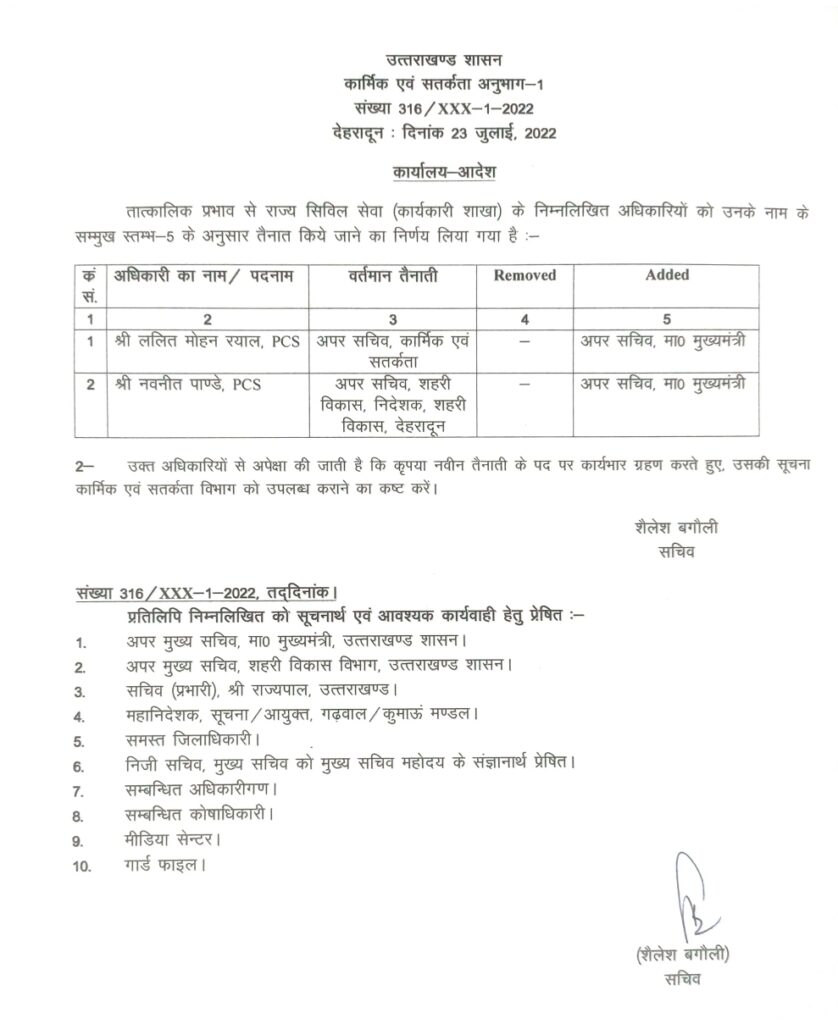 देहरादून, बिग न्यूज़ टूडे: उत्तराखंड में अधिकारियों के तबादलों का सिलसिला जारी है. शासन ने आज आदेश जारी करते हुए ललित मोहन रयाल को अपर सचिव मुख्यमंत्री की जिम्मेदारी दी है. इसके अलावा नवनीत पांडे को भी अपर सचिव मुख्यमंत्री बनाया गया है. बता दें कि यह दोनों ही पीसीएस अधिकारी फिलहाल दूसरी जिम्मेदारियों पर भी तैनात हैं. ललित मोहन रयाल के पास अपर सचिव कार्मिक एवं सतर्कता की जिम्मेदारी है. नवनीत पांडे फिलहाल अपर सचिव शहरी विकास और निदेशक शहरी विकास की जिम्मेदारी भी देख रहे हैं. एक हफ्ते पहले ही देहरादून के जिलाधिकारी और एसएसपी को हटाने के आदेश हुए थे. इससे पहले आईएएस, पीसीएस और सचिवालय सेवा के अधिकारियों की भी एक बड़ी सूची जारी की गई थी. अब मुख्यमंत्री कार्यालय में इन दो पीसीएस अधिकारियों को जिम्मेदारी दे दी गई है.