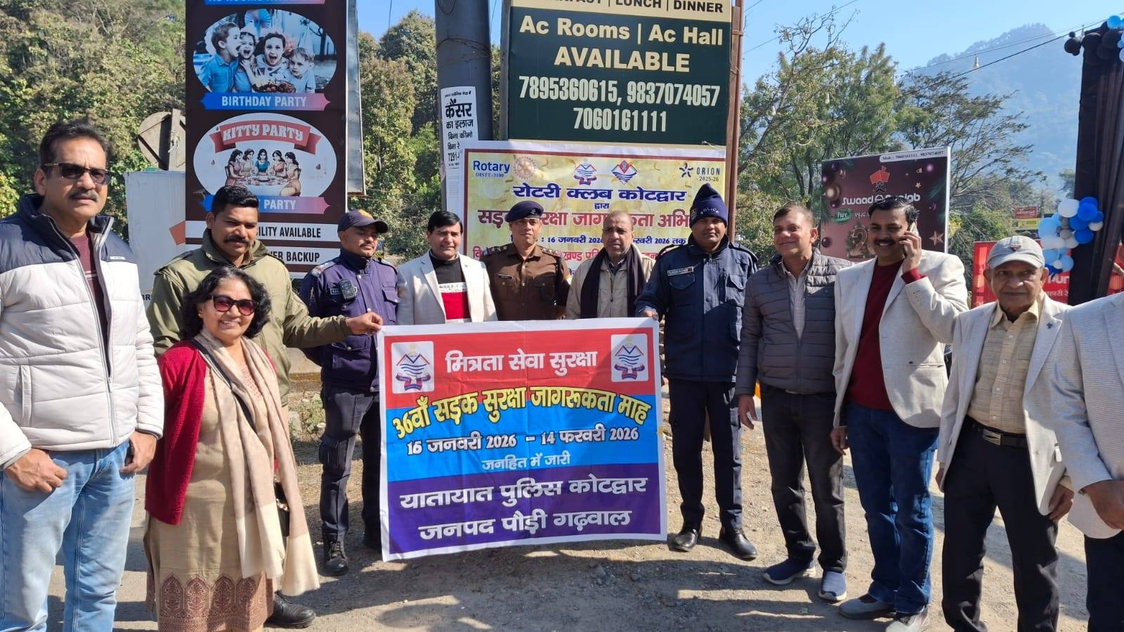 पौड़ी। यातायात कोटद्वार पुलिस द्वारा सड़क सुरक्षा माह 2026 के अंतर्गत निरंतर सड़क सुरक्षा अभियान चलाते हुए आमजन एवं वाहन चालकों को यातायात नियमों के प्रति जागरूक किया जा रहा है। सर्दियों के मौसम में कोहरे व कम दृश्यता के कारण होने वाली सड़क दुर्घटनाओं की रोकथाम हेतु यातायात कोटद्वार एवं रोटरी क्लब कोटद्वार के संयुक्त सहयोग से वाहनों में रिफ्लेक्टर टेप लगाए गए। रिफ्लेक्टर टेप अंधेरे, कोहरे एवं रात्रि के समय दूर से ही वाहन की उपस्थिति को स्पष्ट करता है, जिससे पीछे से आने वाले वाहन चालक समय रहते सतर्क हो जाते हैं और दुर्घटनाओं की संभावना में कमी आती है। इस दौरान पुलिस द्वारा वाहन चालकों को अपने वाहनों पर अनिवार्य रूप से रिफ्लेक्टर टेप लगाने, नियंत्रित गति बनाए रखने, फॉग लाइट का सही प्रयोग करने तथा यातायात नियमों का पालन करने हेतु प्रेरित किया गया।