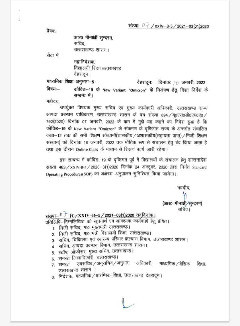 आदेश के अनुसार सचिव एवं मुख्य कार्यकारी अधिकारी, उत्तराखण्ड राज्य आपदा प्रबन्धन प्राधिकरण, उत्तराखण्ड शासन के पत्र संख्या 894 / यू०एस०डी०एम०ए० / 792 (2020 ) दिनांक 07 जनवरी, 2022 के कम में मुझे यह कहने का निदेश हुआ है कि कोविड- 19 के New Variant “Omicron” के संक्रमण के दृष्टिगत राज्य के अन्तर्गत संचालित कक्षा 12 तक की सभी शिक्षण संस्थानों (शासकीय / अशासकीय (सहायता प्राप्त ) / निजी शिक्षण संस्थान) को दिनांक 16 जनवरी, 2022 तक भौतिक रूप से संचालन हेतु बंद किया जाता है तथा इस दौरान Online Class के माध्यम से शिक्षण कार्य जारी रहेगा