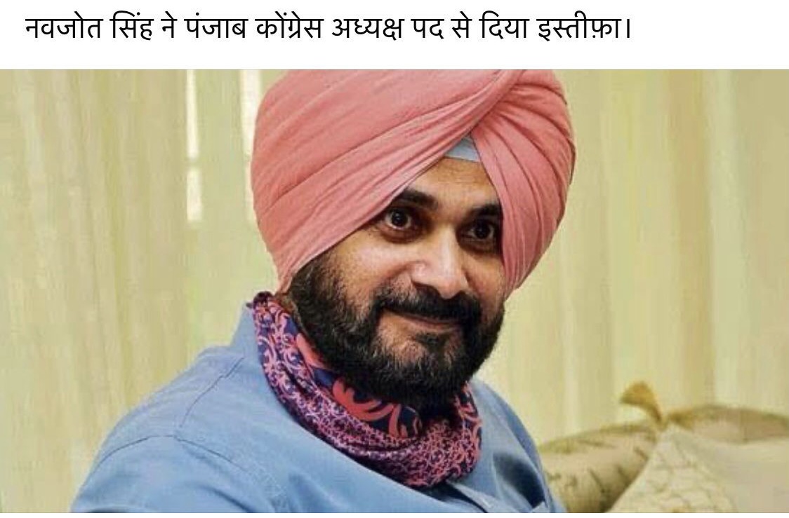 नवजोत सिंह सिद्धू ने दिया पंजाब कांग्रेस प्रदेश अध्यक्ष पद से दिया इस्तीफ़ा नवजोत सिंह सिद्धू ने क़रीब दो महीने पहले ही 23 जुलाई को प्रदेश अध्यक्ष पद का कार्यभार सम्भाला था सिद्धू ने सोनिया गांधी को बोला कि मैं समझोत नहीं कर सकता हूँ।