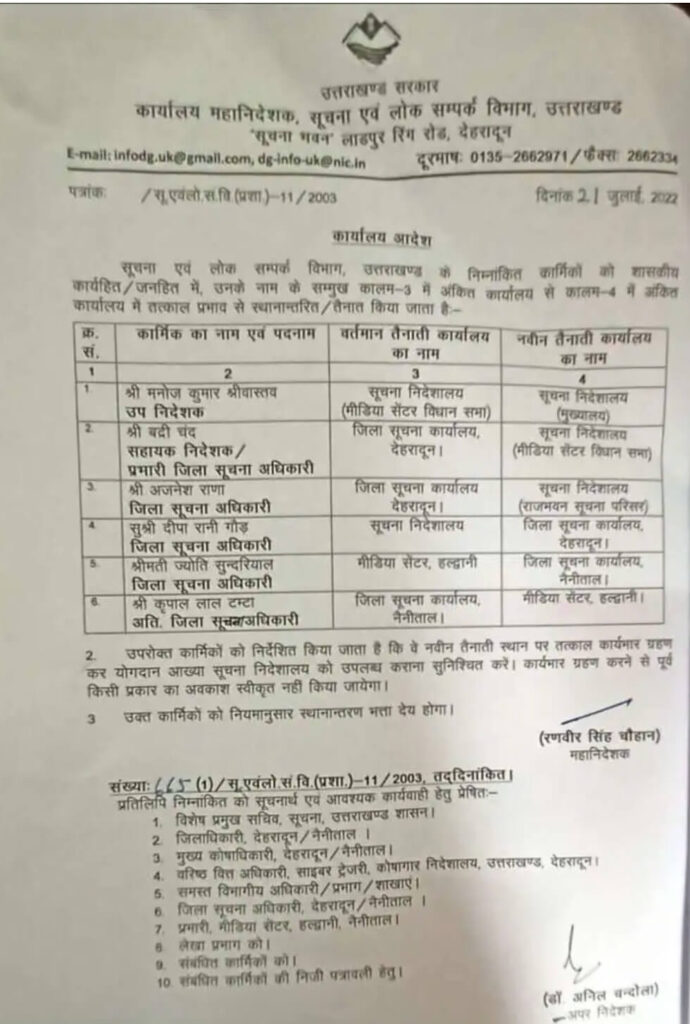 वहीं अतिरिक्त जिला सूचना अधिकारी कृपाल लाल टम्टा को नैनीताल से हटाकर हल्द्वानी मीडिया सेंटर की जिम्मेदारी दी गई है।