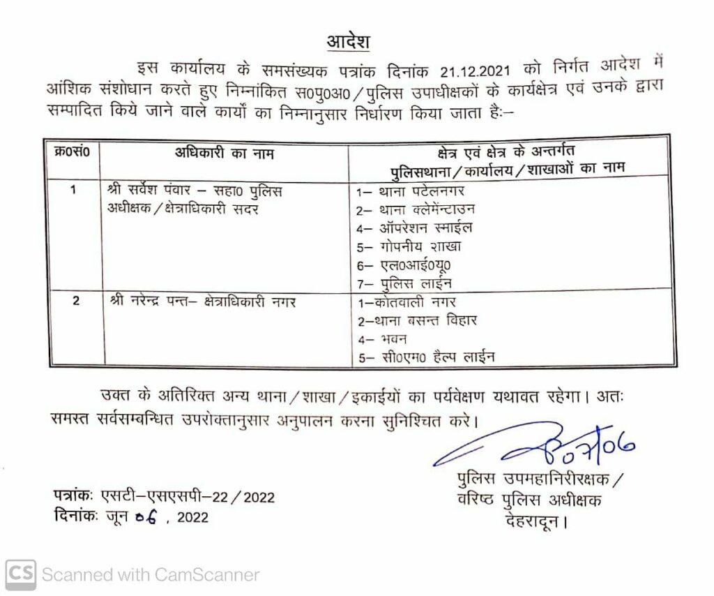 आज दिनांक 07/06/22 को पुलिस उपमहानिरीक्षक/ वरिष्ठ पुलिस अधीक्षक देहरादून द्वारा निम्न स0पु0अ0/ क्षेत्राधिकारियों के कार्यक्षेत्र में बदलाव किये गए।
