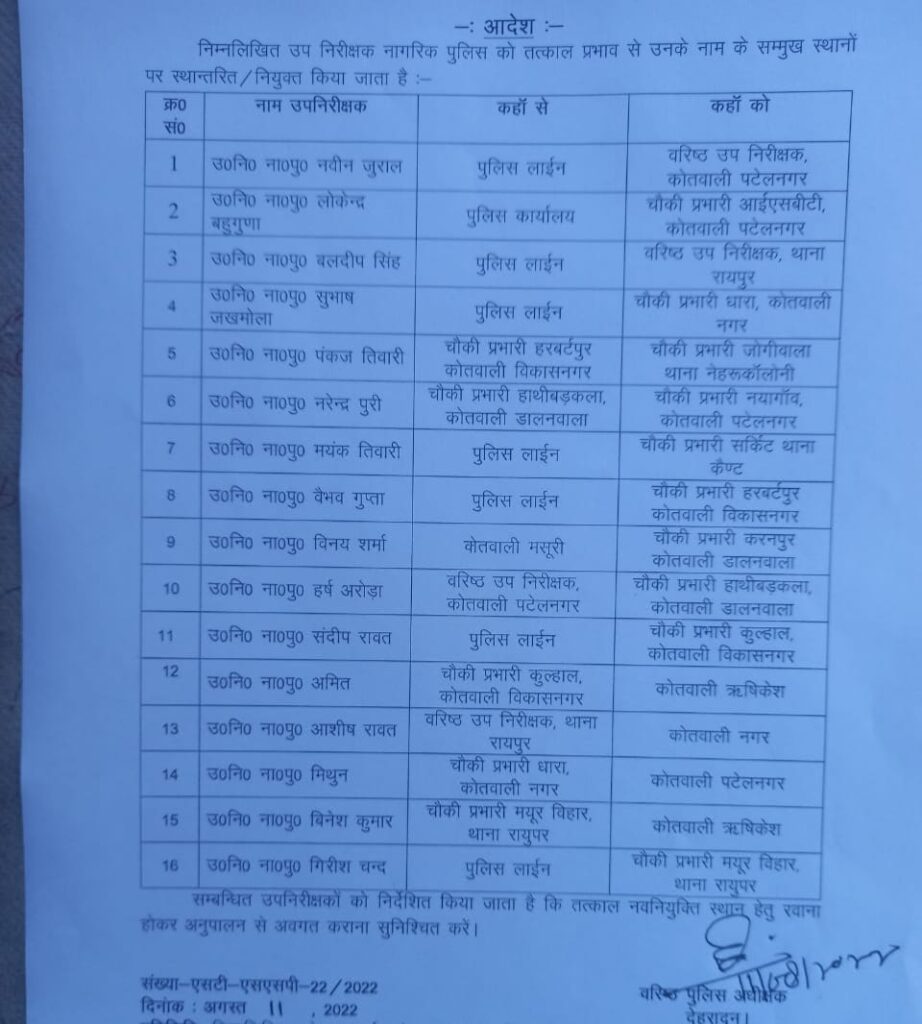 पटेलनगर, कैंट,नेहरु कॉलोनी, मसूरी, विकासनगर, डोईवाला सहित साथ थानों के इंचार्च बदले गए हैं।