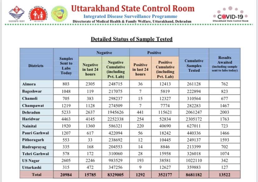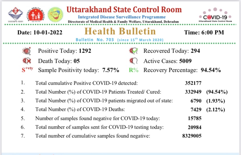 उत्तराखण्ड में कोरोना के 1292 नए मामले,5 मरीजो की मौत