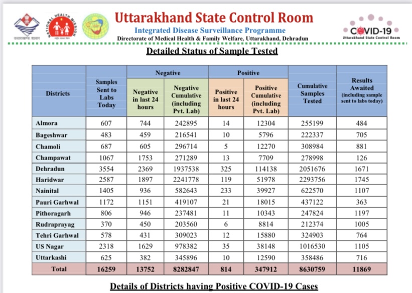 आज उत्तराखंड में कोरोना के (814) मामले सामने आये।