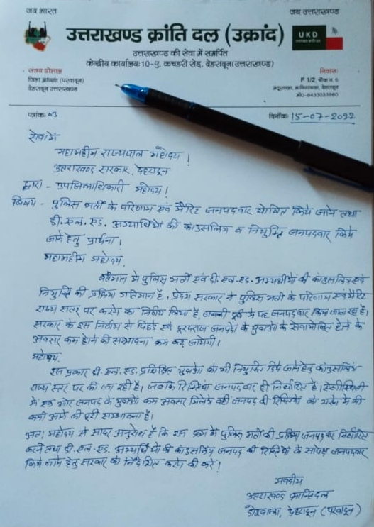 पुलिस भर्तियों में जिलेवार कोटा खत्म करने पर यूकेडी आक्रोशित, सौंपा ज्ञापन