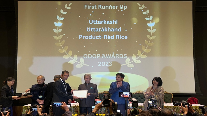 नई दिल्ली स्थित प्रगति मैदान के भारत मंडपम में केन्द्रीय वाणिज्य एवं उद्योग मंत्री श्री पीयूष गोयल की अध्यक्षता में आत्म निर्भर भारत उत्सव का आयोजन हुआ। उत्सव का उद्घाटन समारोह में मुख्य अतिथि विदेश मंत्री डा. एस. जयशंकर ने किया। इस दौरान देशभर के जिलों के बीच कृषि की श्रेणी में उत्तरकाशी जिले ने लाल धान की खेती को लेकर दूसरा स्थान हासिल किया है। इस दौरान मुख्य अतिथि केंद्रीय विदेश मंत्री डा. एस. जयशंकर ने हाथों जिलाधिकारी उत्तरकाशी अभिषेक रूहेला ने जिलों की श्रेणी में प्रथम रनर अप का नेशनल ओडीओपी पुरस्कार ग्रहण किया। इस मौके पर जिले के मुख्य कृषि अधिकारी जे.पी तिवारी के साथ ही महाप्रबंधक जिला उद्योग केन्द्र उत्तरकाशी शैली डबराल भी उपस्थित रही।जबकि ओडीओपी अवार्ड में राज्यों के बीच उत्तराखंड राज्य को भी दूसरा स्थान मिला है। जिलों की श्रेणी में उत्तरकाशी जिले को नेशनल ओडीओपी अवार्ड प्रदान करते हुए केन्द्र सरकार के द्वारा मुख्यमंत्री पुष्कर सिंह धामी के नेतृत्व में राज्य व जिले में कृषि के क्षेत्र में किए गए उल्लेखनीय प्रयासों को सराहा गया है। इधर, मुख्यमंत्री श्री पुष्कर सिंह धामी ने राष्ट्रीय स्तर पर मिले सम्मान की सराहना की। कहा कि टीम वर्क से आगे भी इस तरह के नए उत्पादों को राष्ट्रीय स्तर पर पहचान दिलाएं। मुख्यमंत्री ने राज्य और जिले की टीम को बधाई दी।