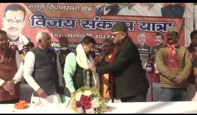 देहरादून 01 जनवरी, भारतीय जनता पार्टी द्वारा प्रदेश भर में आयोजित विजय संकल्प यात्रा शनिवार को मसूरी विधानसभा क्षेत्र में पहुंची। यात्रा का स्वागत स्थानीय विधायक एवं सरकार में मंत्री गणेश जोशी ने किया। विजय संकल्प यात्रा के दौरान सभा का आयोजन मसूरी विधानसभा क्षेत्र में देहरादून के न्यू कैंट रोड स्थित दून वन काम्प्लेक्स सालावाला में हुआ। यात्रा के संयोजक गणेश जोशी एवं पार्टी कार्यकर्ताओं ने अजगर माला से अतिथियों का स्वागत किया। यह यात्रा दिलाराम बाजार से प्रारम्भ होकर राजभवन, मुख्यमंत्री आवास, गढ़ी कैंट होते हुए ओएनजीसी चौक तक गयी।