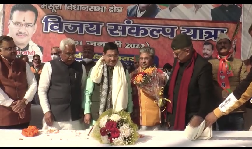 देहरादून 01 जनवरी, भारतीय जनता पार्टी द्वारा प्रदेश भर में आयोजित विजय संकल्प यात्रा शनिवार को मसूरी विधानसभा क्षेत्र में पहुंची। यात्रा का स्वागत स्थानीय विधायक एवं सरकार में मंत्री गणेश जोशी ने किया। विजय संकल्प यात्रा के दौरान सभा का आयोजन मसूरी विधानसभा क्षेत्र में देहरादून के न्यू कैंट रोड स्थित दून वन काम्प्लेक्स सालावाला में हुआ। यात्रा के संयोजक गणेश जोशी एवं पार्टी कार्यकर्ताओं ने अजगर माला से अतिथियों का स्वागत किया। यह यात्रा दिलाराम बाजार से प्रारम्भ होकर राजभवन, मुख्यमंत्री आवास, गढ़ी कैंट होते हुए ओएनजीसी चौक तक गयी।